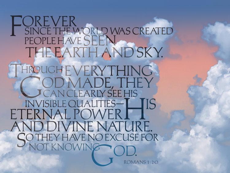 Romans 1:20 "For ever since the world was created, people have seen the earth and sky. Through everything God made, they can clearly see his invisible qualities—his eternal power and divine nature. So they have no excuse for not knowing God." NLT